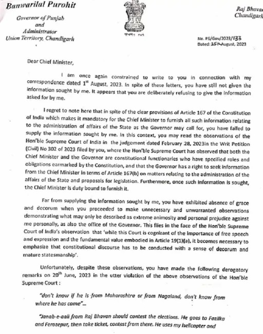 गवर्नर बीएल पुरोहित ने 4 पेज का ये लैटर सीएम भगवंत मान को स्वतंत्रता दिवस वाले दिन यानि 15 अगस्त को लिखा था जो अब सामने आया है।