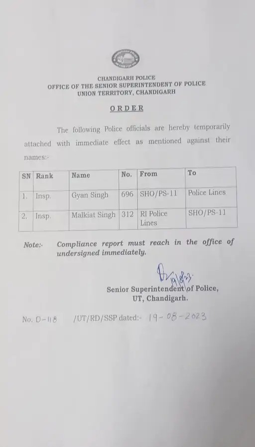विभागीय अधिकारियों ने मामले की गंभीरता को समझ तत्काल प्रभाव से इंस्पेक्टर ज्ञान सिंह को थाना-11 एसएचओ  की जिम्मेदारी से मुक्त कर पुलिस लाइन हाजिर होने के आदेश जारी किए। वहीं अब इंस्पेक्टर मलकीत सिंह ने कई वर्ष बाद बतौर एसएचओ वापसी की है। हालांकि इंस्पेक्टर मलकीत सिंह पहले भी संवेदनशील माने गए पंजाब यूनिवर्सिटी के चुनावों में प्रभावी पुलिसिंग कर चुके हैं।