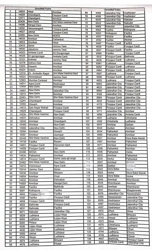 रेलवे ट्रैक जाम होने के बाद अंबाला से अमृतसर, पठानकोट से अमृतसर और पंजाब से चंडीगढ़, जालंधर, लुधियाना से मोगा, फिरोजपुर, फाजिल्का आदि सभी रूट्स पूरी तरह से ठप हैं। इससे आज 203 ट्रेनें प्रभावित हुई हैं।