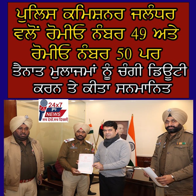 ਪੁਲਿਸ ਕਮਿਸ਼ਨਰ ਜਲੰਧਰ ਵਲੋਂ ਰੋਮੀਓ ਨੰਬਰ 49 ਅਤੇ ਰੋਮੀਓ ਨੰਬਰ 50 ਪਰ ਤੈਨਾਤ ਮੁਲਾਜਮਾਂ ਨੂੰ ਚੰਗੀ ਡਿਊਟੀ ਕਰਨ ਤੇ ਕੀਤਾ ਸਨਮਾਨਿਤ : ਕੰਵਲਪ੍ਰੀਤ ਸਿੰਘ ਚਾਹਲ
